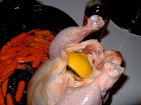 I start by buttering the bottom of the roasting pan. Then I chop some carrots (you could use baby carrots, regular carrots, add potatoes - think big!) and a little sliced onion (I prefer red but whatever you have will do nicely. Add a little chicken stock (I use the powdered stuff and add a little bit of water - yeah, I know... whatever) but I wouldn't use more than a cup if you are using liquid. Place the vegetables in the bottom of the roasting pan and sprinkle with a little sea salt.Inside the chicken I put a big chunk of onion (I usually use the part that I've kept from the bottom when chopping onion for something else), some celery, a few cloves of garlic (whole), pepper sauce, worcestershire sauce (Lea and Perrins) and close the opening with a half a lemon. Place the chicken on top of the vegetables. Rub the chicken with butter (olive oil will work well too) and sprinkle with brown sugar (about 2 tbsp at most) and salt (you could easily sprinkle some herbs here too but I prefer the pure look of the roast with no green on it - just golden!). I like to sprinkle again with Worcestershire sauce and sometimes I'll also do a sprinkle of Soy Sauce and Angostura Bitters